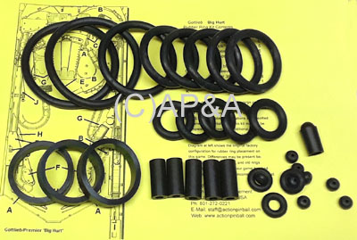 This 33-piece kit includes:- All playfield top-side rubber parts that come in contact with the ball (unless otherwise noted - see note below).