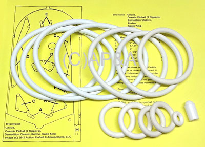 This 13-piece kit includes:- All playfield top-side rubber parts that come in contact with the ball (unless otherwise noted - see note below).