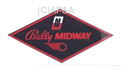 Aftermarket replacement diamond-shaped decal with Bally/Midway logo for coin door. Fits Bally/Midway games in early/mid-1980s that have the stainless steel door with diamond-shaped inset. Measures approx. 6 inches x 3.25 inches. Peel-and-stick application.