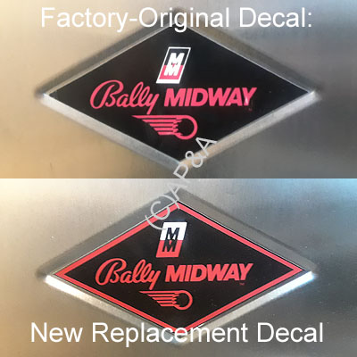 NOTE: This is a new aftermarket replacement decal that has some slight differences from factory-original decals (see additional image below) including a red border around the edge, and a different color scheme to the Midway logo (double M) in center of decal.
