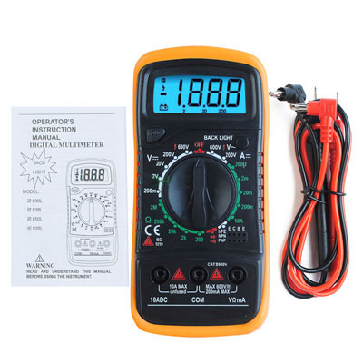 Economy digital multimeter with battery, test leads, and instructions. Multiple functions including continuity/resistance testing, AC/DC voltage, transistor test, diode test, value hold feature, and more. Features back-lit LCD display and auto power-off after 25 minutes. Handles voltages up to 600 volts. Fuse-protected for overload.