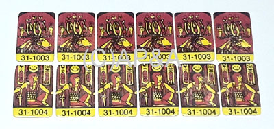 12-piece set of new decals for the drop targets on Williams Pharaoh pinball. Easy to install- just peel and stick. Replacements for original part #s 31-1003 and 31-1004