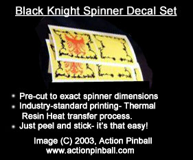 2-piece decal set for spinning target used on Williams Black Knight. Includes 1 decal for front of spinner, and 1 for back of spinner. Restore the worn-out look of your old spinner. Easy to install- just peel and stick!