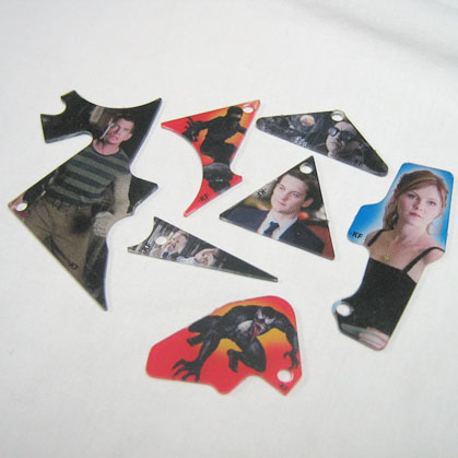 7-piece set of small collectible prompotional plastics for Stern Spider-Man pinball. Can be used as replacements/additions to playfield, or as collectible keychain fob plastics. Factory-original NOS parts in new condition.