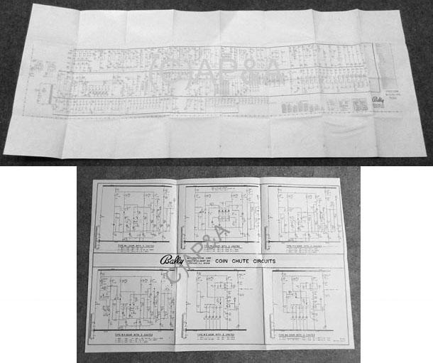 Includes large fold-out main schematic diagram, and separate coin chute circuits diagram. Features diagrams of all circuits with listings of relays/coils/solenoids and part numbers. Reprint diagrams in new condition.