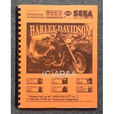 154 pages. Covers Sega Harley Davidson pinball (1st edition). Can also be used with Sega / Stern 2nd and 3rd edition models as well. Includes game operating/adjustment instructions, parts listing & diagrams, adjustments/settings, and wiring / schematic diagrams. Reprint manual in new condition. Original factory part # 780-5067-01.