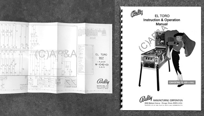 Buy together and save! 2-piece set of game manual and fold-out main schematic wiring diagram for Bally El Toro pinball.