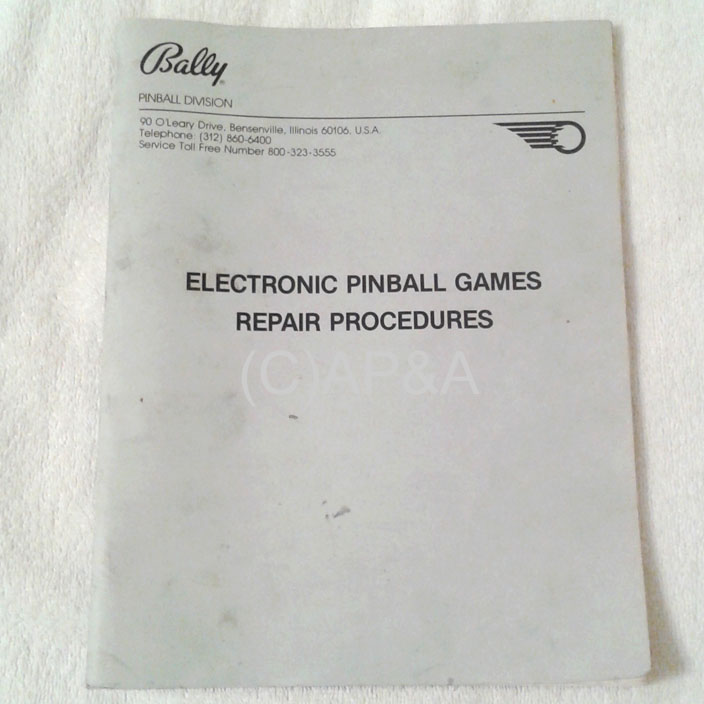 Electronic Pinball Games Repair Procedures #FO-560-2 (January, 1980). 80 pages. For use with electronic solid-state (SS) Bally pinball games made between 1977-1979 (6800 processor-based games w/ MPU board -17, -35). See Sound Board Notes, and game listing, below.