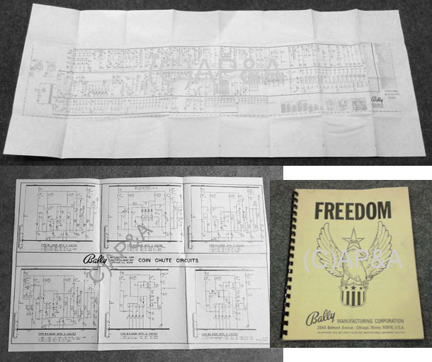 Buy together and save! 3-piece set of game manual and fold-out schematic wiring diagrams for Bally Freedom pinball (electro-mechanical version - see notes below).