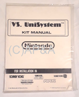 Approx. 40 page manual, plus 7 pages of fold-out diagrams/schematics, and 5 page kit installation instruction sheet for upright and table (red tent) models. Factory-original manual and paperwork in new/unused condition (still in original plastic envelope). For use with a Nintendo Vs. UniSystem conversion kit for installation into an existing Nintendo game (see game listing below). Installation instructions show details for both upright and table models, so we assume this manual/paperwork covers both models. Includes kit installation instructions, final check and adjustments, wiring diagrams, service bulletins, schematics, and parts list.