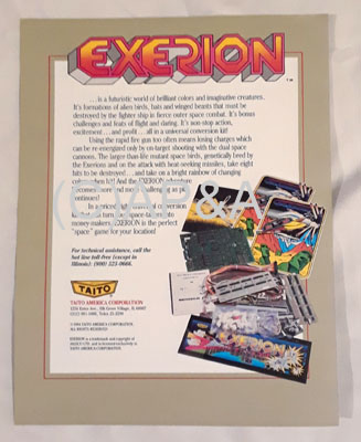 Original 2-page color sales flyer for Taito Exerion arcade game conversion kit. Like-new condition with tiny crease on upper right corner.