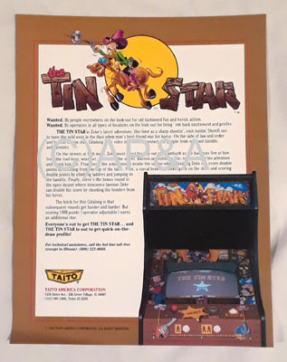 Original 2-page color sales flyer for Taito Tin Star arcade video game. Like-new condition.