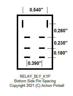 - Pin terminals on this relay are offset: switch terminals (6) measure approx. 0.390 inch apart (center-to-center), and coil terminals (2) measure approx. 0.540 inch apart (center-to-center). See additional image below for pin spacing/measurements.