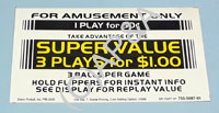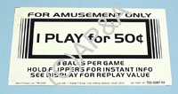 3-ball pricing card for later-model Stern Pinball games 1998-up. Front side: 1 play 50c, 3 plays $1. Back Side (see additional image below): 1 play 50c. Measures 5-1/2 x 3 inches. Factory part # 755-5087-01.