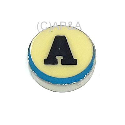 Used plastic playfield insert. 1 inch diameter, 1/4-inch deep. Translucent white with black A on top.