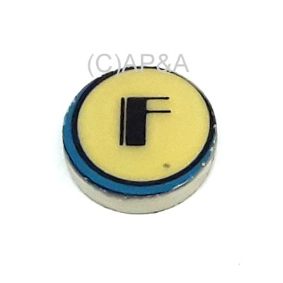Used plastic playfield insert. 1 inch diameter, 1/4-inch deep. Translucent white with black F on top.