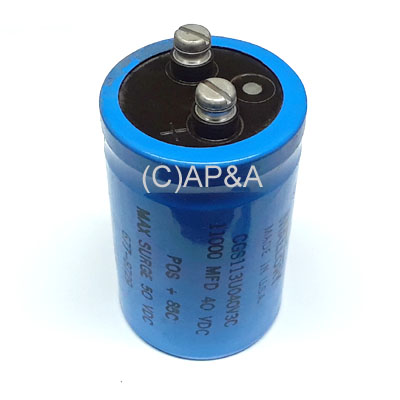 Used large filter capacitor. Rated 11,000uF, 40 volts DC. Measures 3-1/8 inches tall (not including terminals), 2 inches diameter.