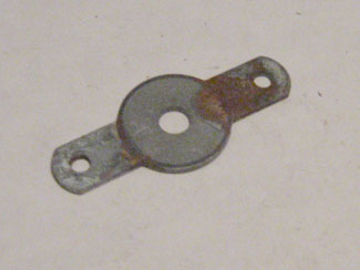 Used metal bracket that mounts to back (inside) of flipper button housing and screws to cabinet wall to hold flipper button and housing in place. As used on many Bally and Stern pinball games, mid 1970s through mid 1980s. Center hole measures 1/4-inch diameter. Replaces Bally # P-1566 and Stern # 1B-494.