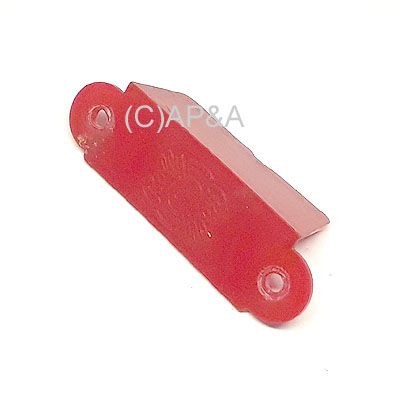 Used red translucent plastic lane guide, 1-sided. 2-3/4-inch overall length, 7/8-inch width, 2-1/8-inch spacing between screw holes, center-to-center. Features raised embossed Bally logo on top. Used on some Bally electro-mechanical (EM) and early solid-state (SS) games.