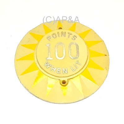 Used pop bumper cap. Yellow starburst design with POINTS 100 WHEN LIT hot-stamped in silver. Measures approx. 3-inches diameter with 1-15/16-inches between screw holes. Used on some vintage Atari, Bally, and Williams games. Will fit some other makes/models as well. Replaces Williams # A-3713-xx, Bally # C-719-xx, and others.