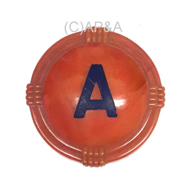 Used vintage pop bumper cap from unidentified game. Deco style cap as used on many games in the 1950s and early 1960s. Red marbled plastic with letter A in dark blue.