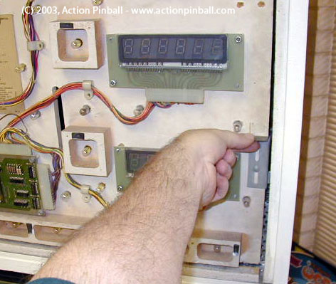 On the insert door panel behind the backglass, locate the TWO latches along the right side, which keep the insert (score display panel) door closed. If your game was shipped to you, these latches may be secured tight with the screws that go through them, and may requiring a bit of loosening with a phillips-head screwdriver to allow the latches to be released.