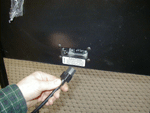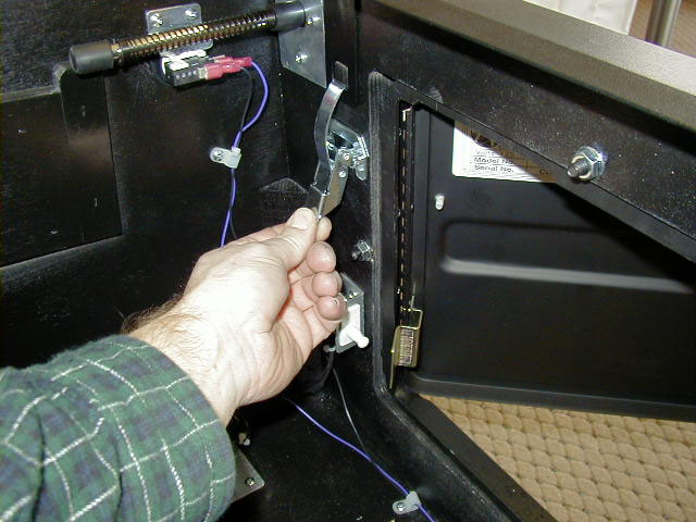 Unlock the front door with the key(s) included with the game hardware, and open. Locate the two latches that hold the lockdown bar in place, and release them. (There is one latch on either side of the front door, on the inside front wall of the cabinet- see picture to the left for more detail.) This will release the playfield glass lockdown bar, and it can then be removed.