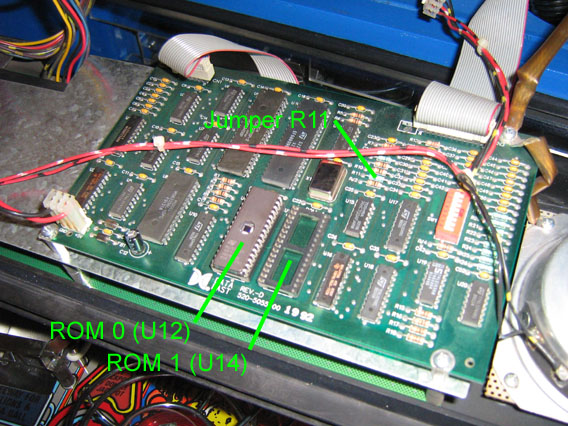 Some Data East, Sega, and late-model Stern pinball games may have shipped from the factory with TWO 2MB ROM chips used on the display unit. Updates to display ROM software may be available on ONE 4MB ROM chip, rather than TWO 2MB chips. When replacing an original TWO-CHIP 2MB ROM SET with ONE 4MB ROM chip, you must remove the jumper at location R11 on the display unit PC board, otherwise the replacement chip will not work. Boards with part # 520-5055-00 shipped with jumper R11 in place, and were set up to use two 2MB ROM chips in locations ROM 0 (U12), and ROM 1 (U14). Likewise, when replacing ONE 4MB ROM chip with TWO 2MB ROM chips, you must install a jumper at location R11, otherwise the replacement chips will not work. Boards with part # 520-5055-01 shipped with jumper R11 absent, and were set up to use one 4MB ROM chip in location ROM 0 (U12), and no ROM chip in location ROM 1 (U14). These modifications are described in Data East Service Bulletin # 38B. A jumper is basically just a wire that connects two points on the board. The points are labeled on the PC board- label is usually located inbetween the two points, or dotted lines will outline the two points as labeled. The jumper may be just a simple bare wire, or a wire with white ceramic around the middle of it, or may look like a resistor. For more details on jumpers and replacing/installing them, see our related Tech Article on Williams games by clicking here. ![]() Programming your own? When combining the data from both chips into a single chip, data from ROM 1 (U14) is written into the lower half of memory in the single chip, and data from ROM 0 (U12) is written into the upper half of memory. If you're uncomfortable doing this kind of work, we recommend leaving it to someone who is experienced. If you know which jumper needs to be set or removed, and don't know a local electronics technician, try taking the board to a local TV/VCR repair shop- they can do the work in a minute or two and may only charge $5 or $10. |